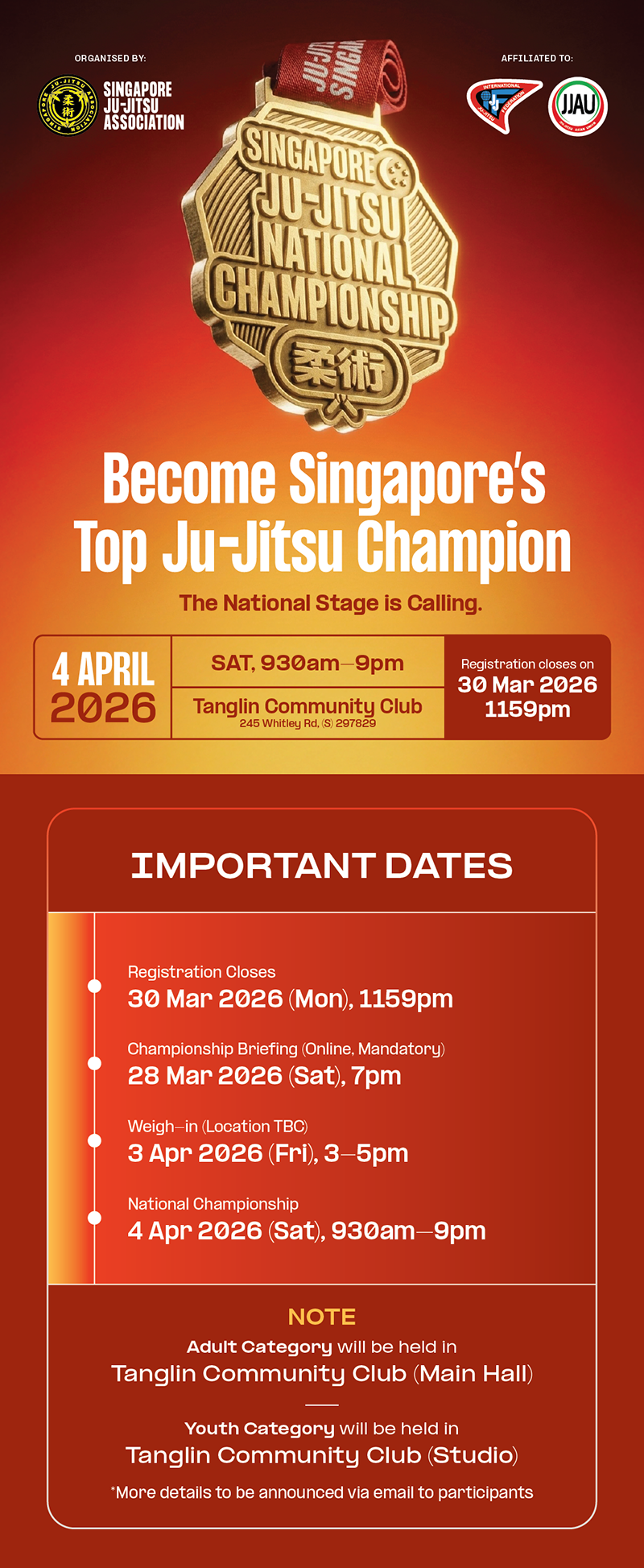 This championship follows Ju-Jitsu International Federation (JJIF) standards and supports national team selection. Qualified Adult athletes from affiliated gyms may be selected to represent Singapore at the Asian Games 2026 (Nagoya, Japan).